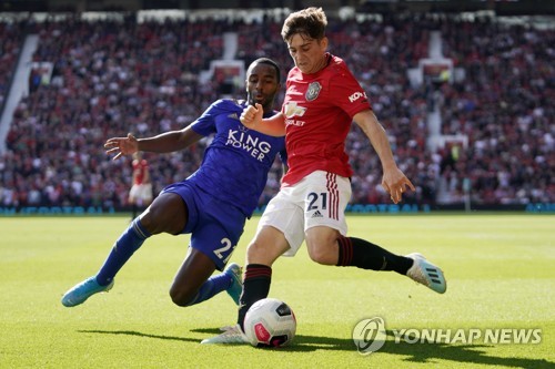 Daniel James (R) of Manchester United vies for the ball against Ricardo Pereira (L) of Leicester City during the English Premier League soccer match between Manchester United and Leicester City at Old Trafford Stadium, Manchester, Britain, 14 September 2019. EPA/WILL OLIVER EDITORIAL USE ONLY. No use with unauthorized audio, video, data, fixture lists, club/league logos or 'live' services. Online in-match use limited to 120 images, no video emulation. No use in betting, games or single club/league/player publications